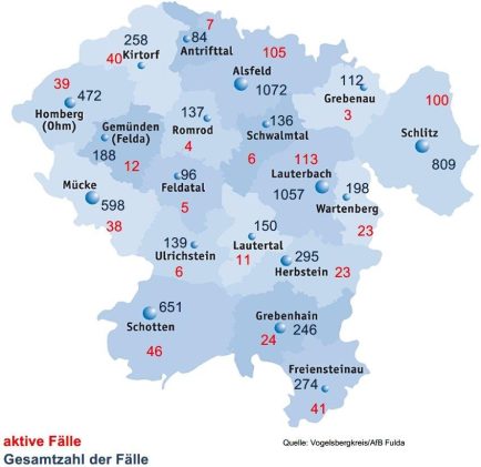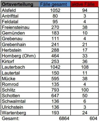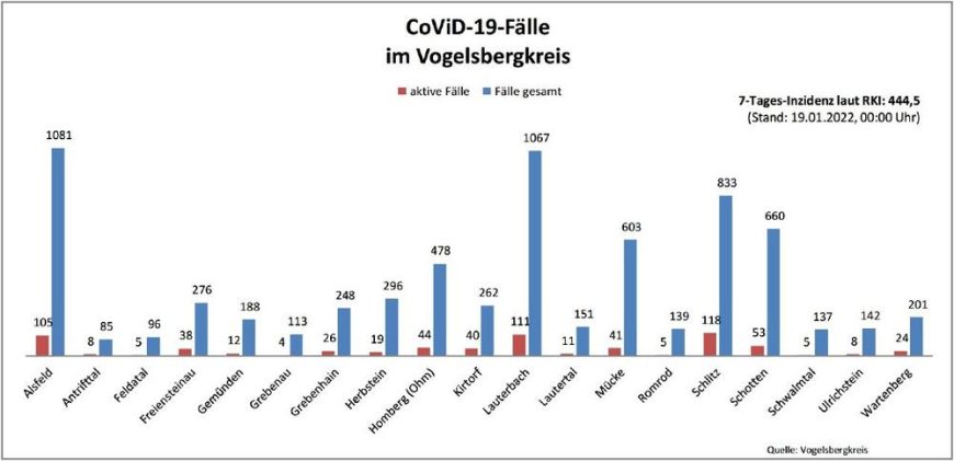 Das Gesundheitsamt des Vogelsbergkreises meldet für das Wochenende und den Wochenbeginn insgesamt 108 Neuinfektionen mit SARS-CoV-2. 66 Menschen meldeten sich bei der Behörde als genesen, diese betreut somit aktuell 646 aktive Fälle. Aufgrund eines Übermittlungsfehlers beim Robert-Koch-Institut (RKI) weist dieses eine abweichende Fallzahl aus. Laut RKI liegt die Sieben-Tage-Inzidenz für das Kreisgebiet bei 441,7 – […]