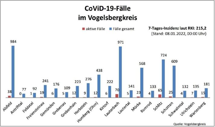 38 neue Fälle mit Corona-Infektionen meldet das Gesundheitsamt des Vogelsbergkreises am Freitag. 26 Menschen haben sich als genesen gemeldet, sodass die Behörde aktuell 302 aktive Fälle betreut. Die Sieben-Tage-Inzidenz im Kreisgebiet ist laut Robert-Koch-Institut (RKI) auf 177,2 gestiegen. Hessenweit liegt der Wert bei 300,2. Bei der Sieben-Tage-Inzidenz der Hospitalisierungen in Hessen weist das RKI einen […]