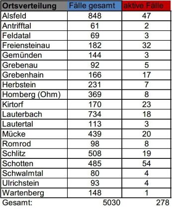 Das Gesundheitsamt des Vogelsbergkreises meldet am Dienstag 48 Neuinfektionen mit SARS-CoV-2. Ein 97-Jähriger verstarb im Zusammenhang mit einer COVID-19-Erkrankung. 42 Menschen haben sich als genesen gemeldet, zurzeit betreut die Behörde 278 aktive Fälle. Die Sieben-Tage-Inzidenz für den Vogelsbergkreis liegt laut Robert-Koch-Institut (RKI) bei 182,9, für Hessen bei 188,4. Die Sieben-Tage-Inzidenz bei den Hospitalisierungen liegt laut […]