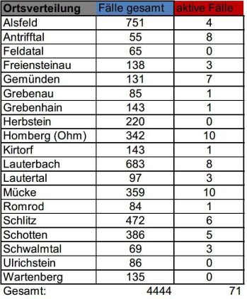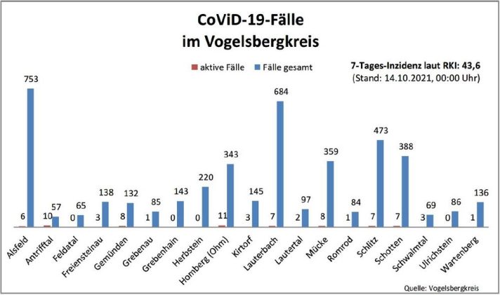 Am Samstag meldet das Gesundheitsamt des Vogelsbergkreises insgesamt 12 Neuinfektionen mit SARS-CoV-2. Diese sind auf verschiedene Städte und Gemeinden im Kreisgebiet verteilt. Drei Menschen meldeten sich genesen, damit werden aktuell 86 aktive Fälle betreut. Für das Kreisgebiet weist das Robert-Koch-Institut eine Sieben-Tages-Inzidenz von 49,3 aus. Hessenweit liegt der Wert bei 54,5. Die Übersicht für den […]