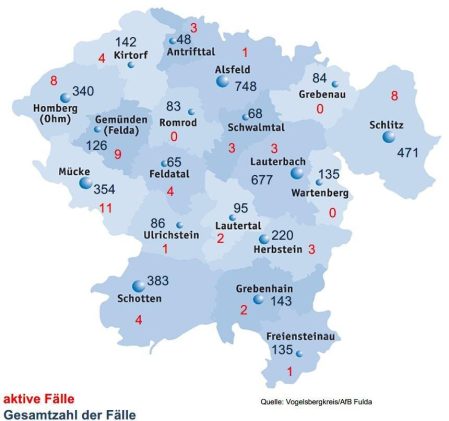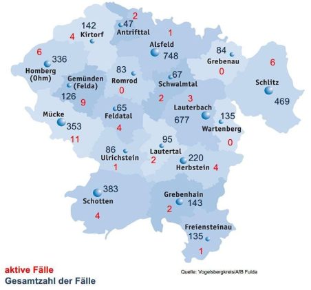Neun weitere Corona-Fälle meldet das Gesundheitsamt des Vogelsbergkreises am Mittwoch und betreut nun 67 aktive Fälle. Vier Menschen haben sich als genesen gemeldet. Die Sieben-Tage-Inzidenz liegt laut Robert-Koch-Institut (RKI) bei 46,4, für Hessen bei 61,4. Die Übersicht für den Vogelsbergkreis: Fälle gesamt: 4403 Genesene: 4227 Verstorbene: 109 Aktive Fälle: 67 Sieben-Tage-Inzidenz: 46,4 Sieben-Tage-Inzidenz für Hessen: […]