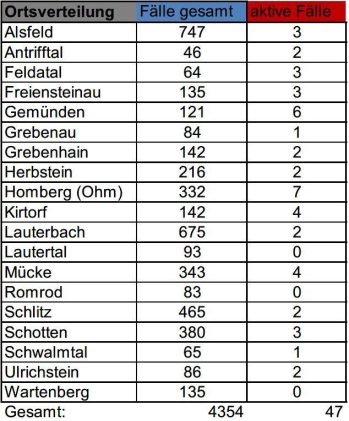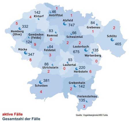 Das Gesundheitsamt meldet am Mittwoch insgesamt zwölf Neuinfektionen mit SARS-CoV-2, verteilt über verschiedene Städte und Gemeinden des Vogelsbergkreises. Die Gesamtzahl der Fälle seit Beginn der Corona-Pandemie steigt dadurch auf insgesamt 4354. Sechs Menschen haben sich als genesen gemeldet – zurzeit betreut die Behörde 47 aktive Fälle. Die Sieben-Tage-Inzidenz liegt laut Robert-Koch-Institut (RKI) bei 28,4 – […]