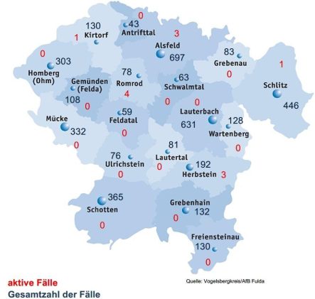 Am Samstag meldet das Gesundheitsamt des Vogelsbergkreises insgesamt drei Neuinfektionen mit SARS-CoV-2. Damit steigt die Gesamtzahl der Fälle im Vogelsbergkreis seit Beginn der Corona-Pandemie auf 4074. Vier Menschen meldeten sich bei der Behörde als genesen, aktuell betreut das Gesundheitsamt zehn aktive Fälle. Für das Kreisgebiet weist das Robert-Koch-Institut eine Sieben-Tages-Inzidenz von 7,6 aus. Hessenweit liegt […]