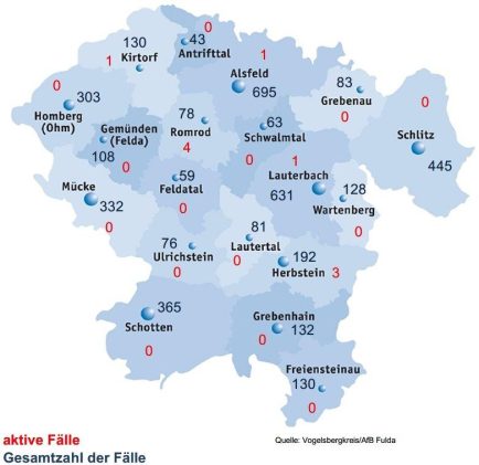 Am Dienstag meldet das Gesundheitsamt des Vogelsbergkreises drei bestätigte Neuinfektionen mit SARS-CoV-2. Damit steigt die Gesamtzahl der Fälle im Kreisgebiet seit Beginn der Corona-Pandemie auf 4077. Die Zahl der aktiven Fälle liegt aktuell bei 12, eine Person meldete sich bei der Behörde als genesen. Die Sieben-Tage-Inzidenz, die das Robert-Koch-Institut für das Kreisgebiet ausweist, liegt bei […]