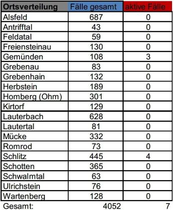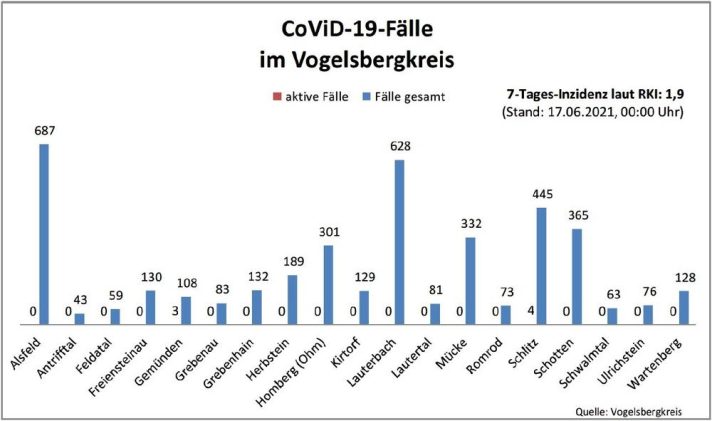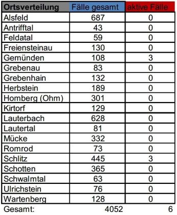 Der Vogelsbergkreis kann weiter eine Sieben-Tage-Inzidenz von 0,0 vorweisen, da dem Gesundheitsamt erneut keine Neuinfektionen mit SARS-CoV-2 gemeldet wurden. Aktuell betreut die Behörde nur noch zwei aktive Fälle, nachdem sich vier Menschen als genesen gemeldet haben. Für Hessen ist die Sieben-Tage-Inzidenz laut Robert-Koch-Institut auf 9,2 gesunken. Die Übersicht für den Vogelsbergkreis: Fälle gesamt: 4052 Genesen: […]