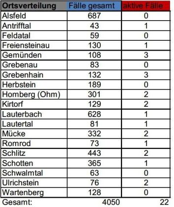 Das Gesundheitsamt des Vogelsbergkreises meldet am Samstag erneut keine Neuinfektionen mit SARS-CoV-2, sodass die Gesamtzahl der Fälle seit Beginn der Corona-Pandemie weiterhin bei 4050 liegt. Zurzeit betreut die Behörde noch 15 aktive Fälle. Die Sieben-Tage-Inzidenz für den Kreis liegt laut Robert-Koch-Institut bei 4,7 – für Hessen bei 22,1. Die Übersicht für den Vogelsbergkreis: Fälle gesamt: […]