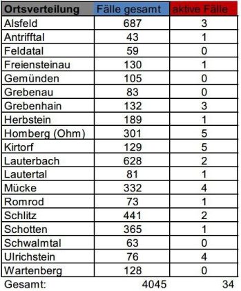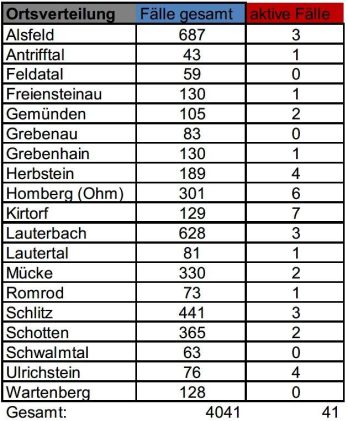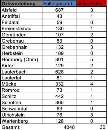 Das Gesundheitsamt des Vogelsbergkreises meldet am Mittwoch eine Neuinfektion mit dem Corona-Virus. Die Gesamtzahl der Fälle ist damit auf 4049 gestiegen. Die Behörde betreut aktuell noch 23 aktive Fälle. Die Sieben-Tage-Inzidenz für den Kreis liegt laut Robert-Koch-Institut bei 10,4 – für Hessen bei 23,8. Die Übersicht für den Vogelsbergkreis: Fälle gesamt: 4049 Genesene: 3919 Verstorbene: […]