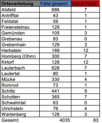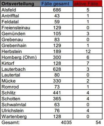 Das Gesundheitsamt des Vogelsbergkreises meldet am Dienstag keine Neuinfektionen mit dem Corona-Virus, sodass die Gesamtzahl der Fälle im Kreis bei 4035 bleibt. 29 Menschen haben sich als genesen gemeldet – die Behörde betreut aktuell 54 aktive Fälle. Die Sieben-Tage-Inzidenz für den Vogelsbergkreis stagniert bei 26,5, für Hessen liegt der Wert bei 42,5. Die Übersicht für […]