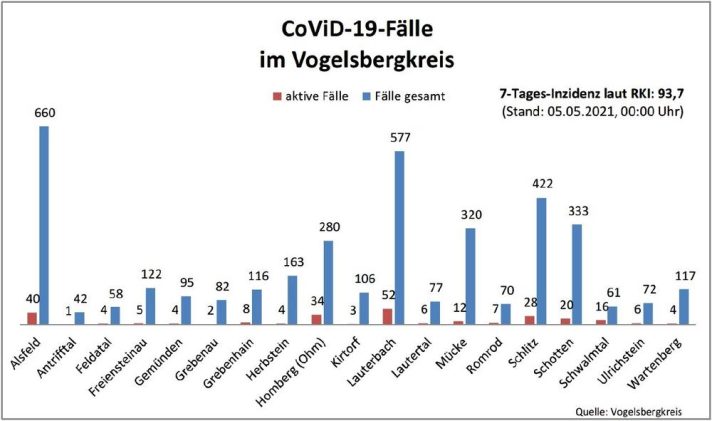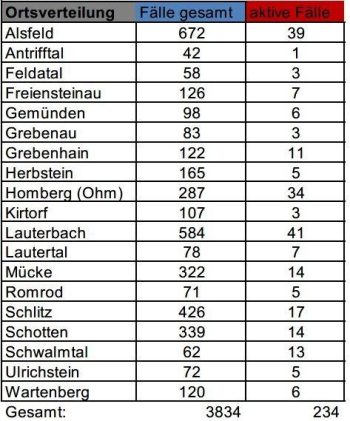 Das Gesundheitsamt des Vogelsbergkreises meldet am Samstag 14 Neuinfektionen mit dem Corona-Virus. Damit liegt die Gesamtzahl der nachgewiesenen Infektionen im Kreisgebiet nun bei 3834. Aktuell betreut die Behörde 234 aktive Fälle – 25 Menschen meldeten sich als genesen. Für das Kreisgebiet weist das Robert-Koch-Institut eine Sieben-Tages-Inzidenz von 83,3 aus. Hessenweit liegt dieser Wert bei 123,1. Die […]