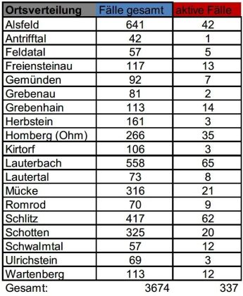 Wie das Gesundheitsamt des Vogelsbergkreises mitteilt, sind 29 bestätigte SARS-CoV-2-Infektionen im gesamten Kreisgebiet nachgewiesen worden. Damit steigt die Gesamtzahl der Fälle im Vogelsberg seit Beginn der Corona-Pandemie auf 3703. Im Lauf des Tages meldeten sich 35 Menschen als genesen – damit liegt die Zahl der aktiven Fälle bei 331. Für das Kreisgebiet weist das Robert-Koch-Institut […]
