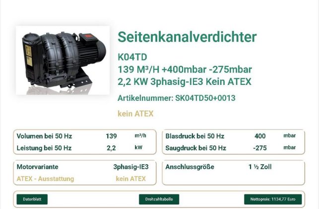 Mit einer maximalen Druck- und Vakuumdifferenz von 150 mbar und einem Volumenstrom von 138 m³/h bei 50 Hz eignet sich dieses Modell besonders für kleinere bis mittlere Prozessluftaufgaben. Dank der MOR‑Ausführung, bei der das Laufrad direkt auf der Motorwelle sitzt, arbeitet der Verdichter vibrationsarm, leise und wartungsfrei. Die kompakte Bauform und das geringe Gewicht ermöglichen eine einfache Integration […]
