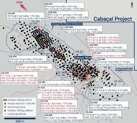Meridian assays multiple stacked layers of high-grade Cu-Au-Ag including CD-544: 38.2m @ 3.2g/t AuEq from 78.9m