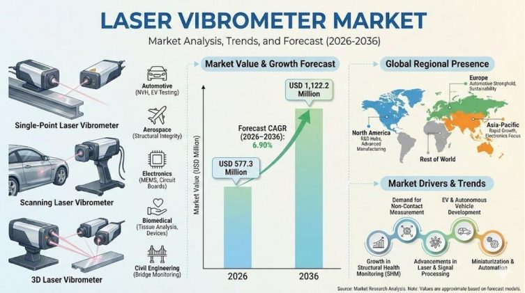 Global Laser Vibrometer Market Shows Resilient Growth Outlook The global laser vibrometer market is entering a phase of sustained, technology-led growth as industries increasingly rely on non-contact vibration measurement for accuracy, safety, and efficiency. Valued at USD 577.3 million in 2026, the market is forecast to reach USD 1,122.2 million by 2036, expanding at a […]